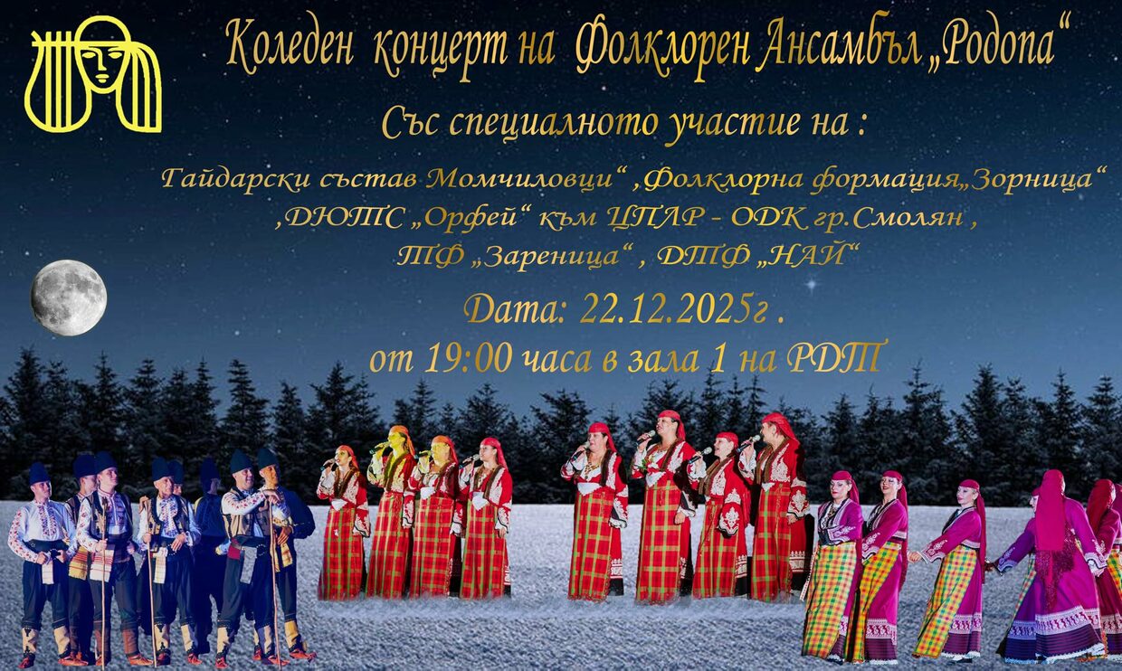 Фолклорен ансамбъл „Родопа“ – Смолян кани жителите и гостите на града на своя традиционен Коледен концерт, който ще се състои на 22 декември 2025 г. от 19:00 часа в Зала 1 на Родопския драматичен театър. Входът за събитието е свободен.