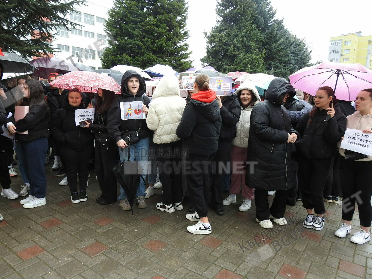 Протестиращите скандираха „Оставка“,“Шампиони сме“;“Искаме нашите учители“.Те призоваха с викове „Излезте!“директорката Маргарита Демирева да излезе и   да обсъдят създалата се ситуация.Ученици носеха плакати с надписи“Спрете произвола!“;“Върнете хората,които обичаме!“;“ Не на неспрадливостта!“.