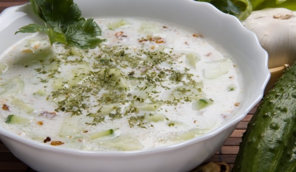 Чесънът се счуква със сол до побеляване. Прибавят се краставицата, обелена и нарязана на ситно. Прибавят се след това листата от марулята, измити добре и нарязани на ситно, ситно нарязаният копър, оце...