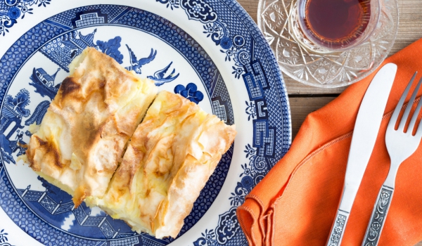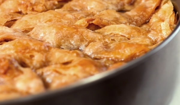 В намазана с масло тавичка се нареждат корите, като всеки ред се поръсва с мазнина, а между два реда кори се поставя плънка, която е приготвена от киселото мляко, содата, яйцата и сиренето. Отгоре ба...