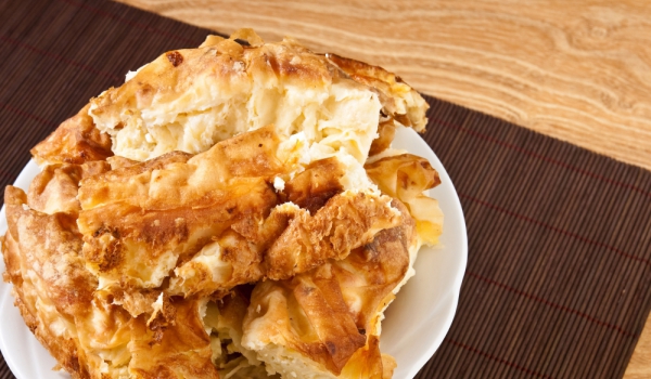 Омесваме тесто за корите на баницата от брашното, вода и малко сол. Разточваме корите - максимално тънки, които леко се изпичат. Приготвяме плънка от сварения булгур и натрошеното сирене. Започваме да...