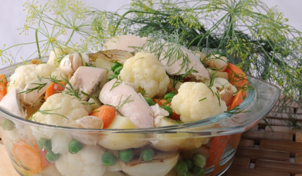 Морковите, зеленият фасул, грахът и карфиолът се сваряват поотделно. Щом се отцедят и изстинат, се нарязват на кубчета, а карфиолът се накъсва на розички. Добавят се нарязаните на кръгчета домати и к...