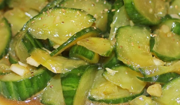 Краставиците се измиват, обелват и нарязват на ивици. Поръсват се със солта и се оставят за 20 минути да си пуснат сока. Поръсват се със захарта. Лукът се нарязва на дребно. Олиото се загрява и с...