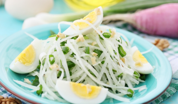 Лукът се обелва и се запича във фурна. След като изстине, се нарязва на колелца. Добавят се нарязаните на кубчета яйца, зехтинът и оцетът. Поръсва се със сол и салатата се разбърква. Поръсва се с ба...