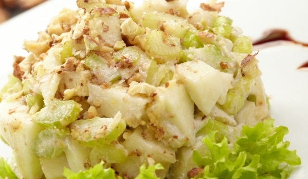 Ябълките се измиват, почистват и нарязват на кубчета. Поливат се със сока на лимона и се добавят нарязаните на ситно орехови ядки, целина и парченцата риба. Салатата се залива с дресинг, приготвен от...