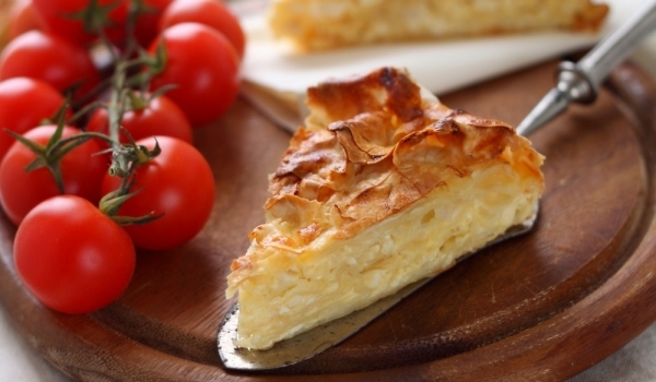 1. От брашното, водата, оцета, солта и олиото се замесва тесто. Разделя се на 5 топки и се разточват кори. 2. Нареждат се в намазана с мазнина тава една върху друга, като се поръсват с мазнина. 3. Н...