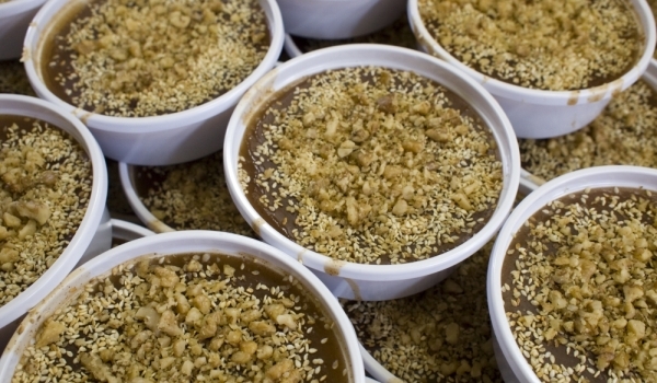 Вземете 2 кори, намажете ги с разтопено масло, поръсете с част от орехите и натрошената тахан халва и посипете с малко захар. Завийте на руло, сложете в намазнена тава и повторете до изчерпване на кор...