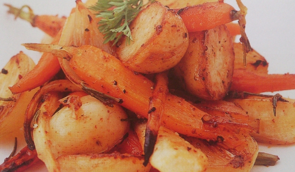 Морковите обелете и разрежете на половинки, пащърнака обелете и нарежете на лентички. Почистените бейби картофчета разполовете, както и малките лукчета. Загрейте в тиган зехтина и сотирайте всички зе...