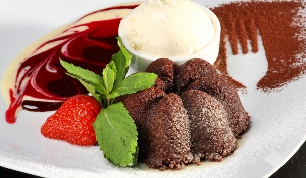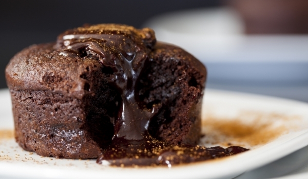 Загрейте предварително фурната до 230 градуса, а на водна баня разтопете шоколада заедно с маслото. Отделно с миксер разбийте яйцата заедно с жълтъците и захарта. Разбийте и разтопения шоколад, след...