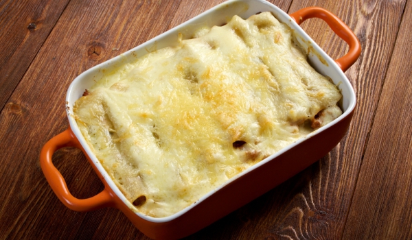 Канелоните се приготвят според указанието на опаковката. Смесва се крема сиренето, раздробеното синьо сирене, бланшираният спанак, зехтинът, риганът и босилекът. За бешамеловия сос се разтапя маслото,...