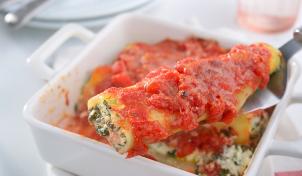 Сварете купешките канелони в кипяща подсолена вода без да ги преварявате. Нека канелоните да останат леко твърди. Нарязаните спанак и лук се задушават в маслото. Прибавят се останалите продукти и се...