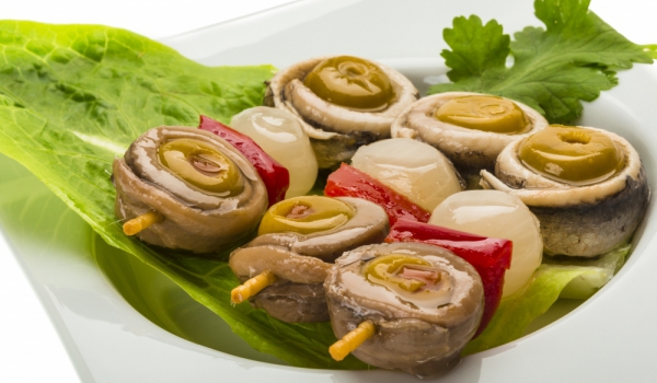 Вземе клечки за зъби и с пръсти нанижете каперсите. Навийте филетата от аншоа и ги сложете плътно до тях. След това сложете една краставичка и лукче. Продължавайте по същия начин докато направите всич...