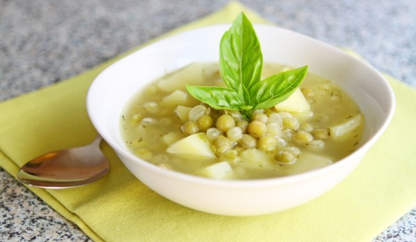 Загрейте 3-4 с.л. олио и запържете накълцания лук. След това долейте 1 л гореща вода и прибавете граха и картофите. Сложете подправки на вкус, разбъркайте и оставете да къкри за 30 минути, като бърк...
