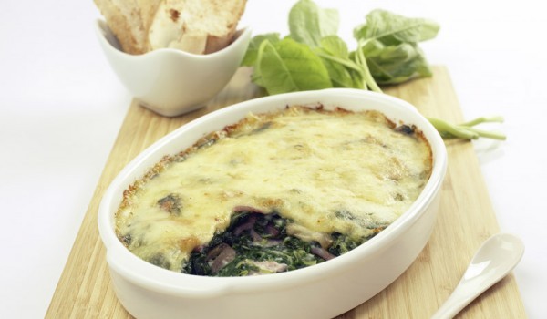 Кипнете спанака в малко подсолена вода. Отцедете го, нарежете на ситно и смесете с настърганото сирене и 2 разбити яйца. Сварете и отцедете макароните. В намазан с масло огнеуорен съд редете последов...