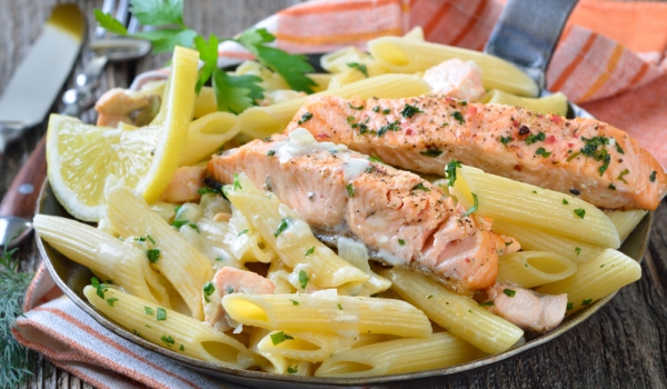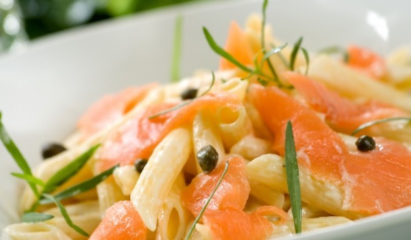 Сьомгата се запържва в маслото, прибавя се сметаната, пасираният чесън, нарязаният на ситно копър, солта и черният пипер. Разбърква се добре. Макароните се варят според указанията на опаковката, отце...
