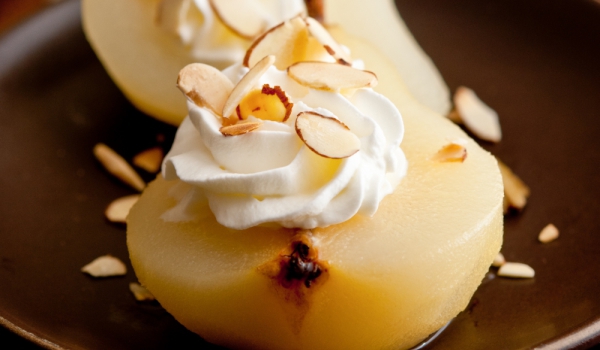 Сушените сини сливи се смесват с мармалада. Крушите се разрязват на две и се отстранява сърцевината. Във вдлъбнатините се слага по една сушена синя слива. Сиренето се смесва със сметаната и с пудрата...