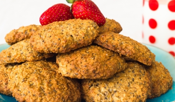 Разбийте маслото заедно със захарта до гладък крем. Отделно разбъркайте пресятите брашна заедно с малко сол и зърната от чия. Сипете сухата смес към маслото. Объркайте до хомогенност и прехвърлете въ...
