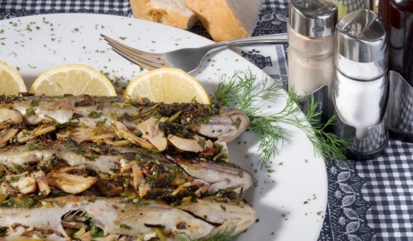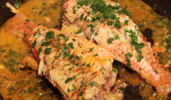 Нарежете почистената риба на парчета. Наредете я в тенджера върху нарязани на колелца лук, моркови и целина. Сипете виното и бульона, сложете маслото и посолете, Захлупете тенджерата и оставете ястие...
