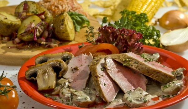 Намажете месото с олиото и го оставете в хладилник 12 ч. Сложете го в тавичка със сгорещената мас, запържете го леко от всички страни. Прибавете морковите, нарязани на кръгчета, целите глави лукчета...