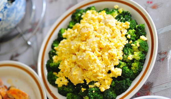 Броколито се вари в подсолена и вряща вода около 8 мин. Изцежда се и се къса на розички. Чесънът се запържва в 4 с.л. от зехтина, след което се изхвърля. Прибавят се броколите. Яйцата се разбъркват з...