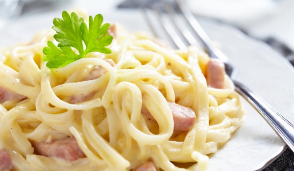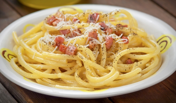 Чесънът се запържва около 1-2 мин. Прибавя се беконът, изцежда се върху кухненска хартия. Яйцата се разбиват с двата вида сирене, като се отделя малко от пармезана за поръсване. Овкусява се със солта...