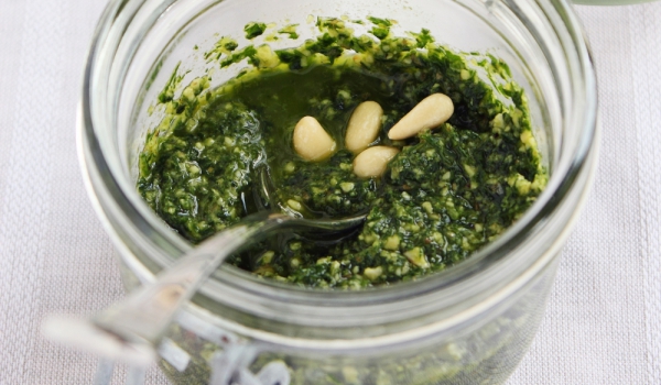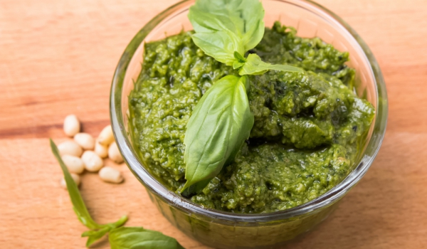 1. Чесънът и кедровите ядки се начукват заедно с морската сол до гладка смес. 2. Постепенно се прибавя босилекът и се продължава да се счуква сместа. 3. Прибавят се и двата вида сирене. 4. Долива с...