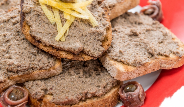 Нарежете франзелата на филийки. Намажете филийките с малко масло. След това ги подредете в тава и ги запечете в предварително загрята фурна на 200°С фурна за около 5-7 минути. Задушете дробчетата в ч...