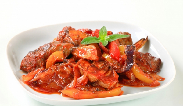 Нарежете лука на филийки, посолете и го задушете в мазнината в похлупен съд. Прибавете дробчетата, чушките, настърганите домати и продължете да задушавате под капак, докато ястието остане на мазнина....