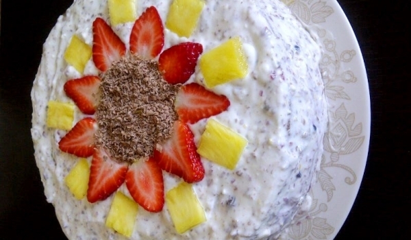 Почистените 200 г плодове нарежете при нужда и ги намачкайте. Останалите 200 г нарежете на ситни парченца. Разбийте заедно киселото мляко, изварата и крема сиренето, като по желание може да долеете и...