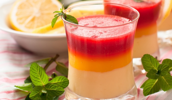 Плодовете от компотите се отцеждат и нарязват на кубчета. Останалите плодове се обелват при нужда и се нарязват на кубчета със същата големина. Черешите се изчистват от костилките. Желатинът се накис...