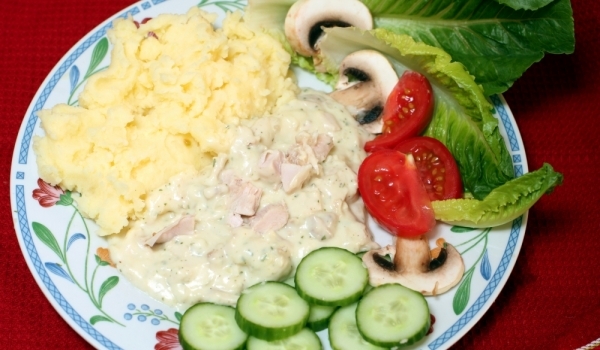 Нарязваме пилешкпто на хапки и посоляваме. В йенска тенджера нарязваме част от гъбите, киселите краставички и пушеното сирене, добавяме пилето като ръсим с черен пипер. Режем останалите гъби, краста...