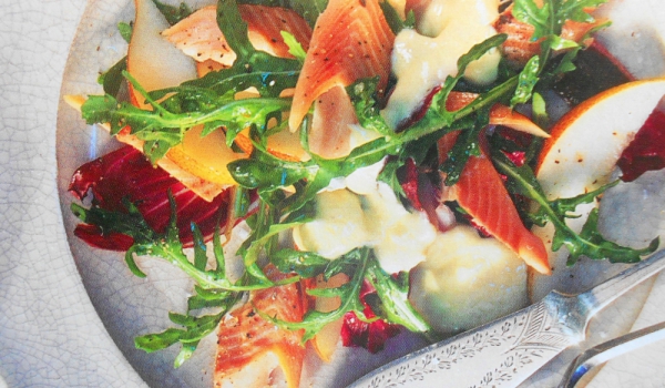 Пъстървата се чисти от кожата и костици, реже се на парченца. Крушите се разполовяват и се поръсват с лимонов сок, за да запазят свежестта си. Прибавят се руколата и радиачио. Осолява се. За дресени...