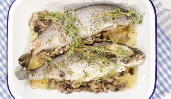 Рибата се почиства, посолява се и се намазва с масло. Приготвя се следната плънка: задушават се нарязаните на дребно гъби, прибавят се сол, пипер, ситно нарязан магданоз. С така приготвената смес се...
