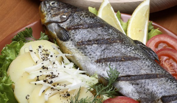 Почистете рибата и посолете. Поръсете я с черен пипер и зехтин. След това напълнете рибата с парчета лимон и печете на умерено загрята скара. По желание може да сервирате с гарнитура от пържени карто...