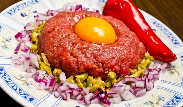 Говеждото месо се скълцва на много ситни и фини късчета. Омесва се в купа с 1 жълтък от прясно яйце, 1 с.л. олио, сос уорчестър, горчицата, скълцаните лук, магданоз и всички подправки. Ако предпочитат...
