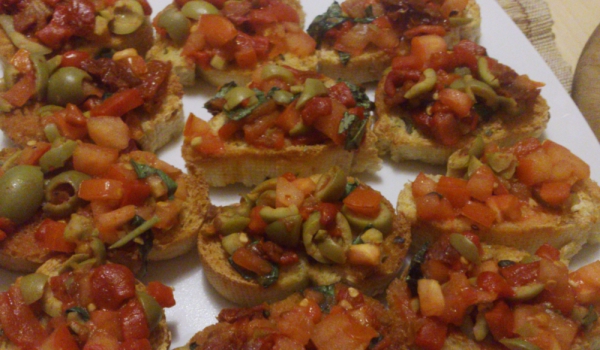 Нарежете франзелата на филийки и ги изпечете, докато станат хрупкави. След това намажете филийките със зехтин и върху тях поставете смес приготвена от обелените и нарязани на кубчета домати, нарязани...