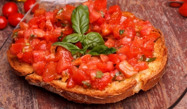 Нарежете франзелите на филийки под наклон. Натъркайте ги с чесън и ги запечете в тава във фурната. През това време скълцайте ситно доматите, които трябва да са зрели, но да не са прекалено меки. Доб...