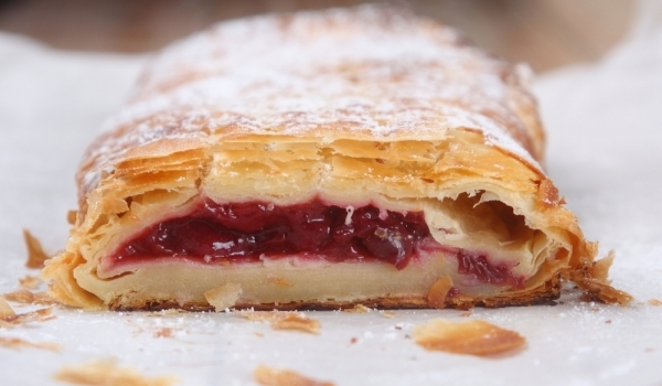 Измийте добре черешите и им махнете костилките. Поръсете ги със захарта и 2-3 лъжици галетата и разбъркайте. Разстелете бутертестото и в единия му край наръсете малко от галетата и върху тях поставете...