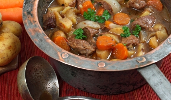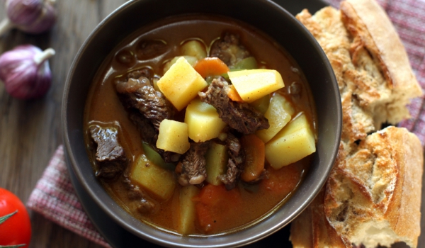 Нарежете лука, чесъна и моркова на тънки сламки. Доматите се обелват и нарязват на малки кубчета. Месото и картофите са нарязват на едри парчета. Загряваме маслото и запържваме лука до златисто. Доба...