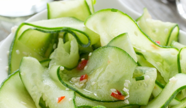 Краставицата се обелва и се нарязва на ивички. Ивичките се слагат в гевгир и се поръсват със солта. Оставят се да се отцедят за половин час. Прехвърлят се в купа и се заливат със сос, приготвен от д...