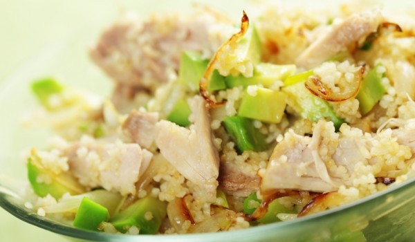 Сварете кус куса в подсолена вода и го отцедете. Сипете го в купа и прибавете обеленото и нарязано на кубчета авокадо. Пилешкото сварете предварително и леко запържете в малко мазнина. Нарежете го на...