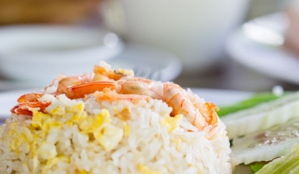 Изсипете предварително попарения ориз във вряща подсолена вода и го сварете до омекване. Залейте го със студена вода и го оставете да се отцеди. Изпържете лука, прибавете нарязаните чушки, скаридите...