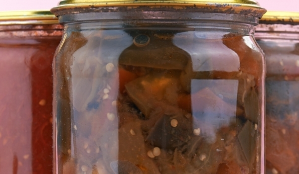 Обелете патладжаните и ги нарежете на ивици. Осолете ги и ги оставете поне 4-5 часа за да се отцедят от горчивия сок. Изплакнете зеленчуците от солта. Смесете продуктите са маринатата и ги кипнете. Н...