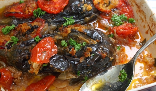 Разполовете патладжаните, след като им извадите дръжките. Надупчете ги с ножа, осолете ги и ги оставете под наклон 30 мин., за да се отцедят от горчивината. След това ги изплакнете и подсушете. Загре...