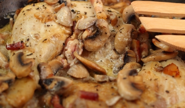 Нарежете пилето на порции. Загрейте маслото и запържете пилето и ситно нарязания лук. Когато месото се зачерви от всички страни, го залейте с бульона и го оставете да се задушава на тих огън за около...