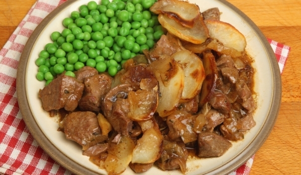 Нарежете месото на кубчета или жулиени. Овъргаляйте го в смес от брашно, сол и черен пипер на вкус. Загрейте силно маслото и запържете за кратко парчетата месо. Когато месото се запече, добавете лука...