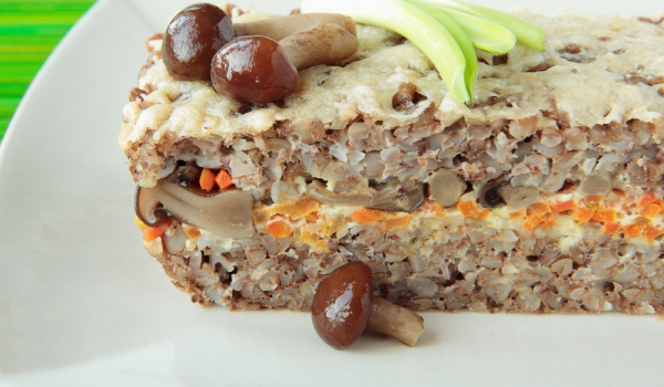 Лукът се реже на ситно и се пържи в маслото 4 минути. Добавят се нарязаните на ситно гъби, добавя се сол и се пържи десетина минути на слаб огън. В тава, намазана с мазнина, се слага половината от св...