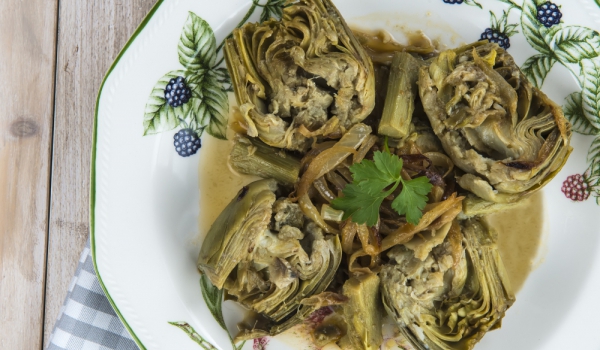 Артишокът се почиства. Отстраняват се твърдите и външни листа. Накисва се в студена вода и лимоновия сок. Изцежда се добре. Артишокът и лукът се пържат в загрято олио около 15 мин. Вадят се с решетъч...