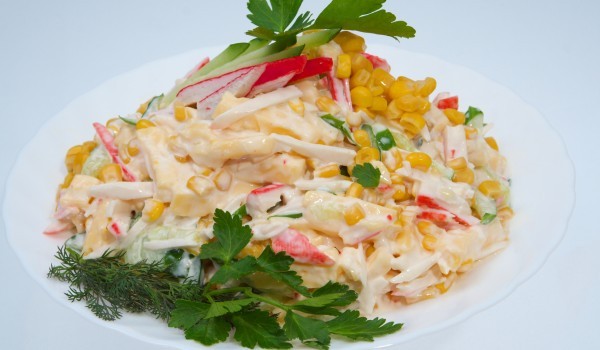 Яйцата твърдо се сваряват, след това всичко се нарязва на кубчета и се смесва с майонезата и подправките. Сервира се върху листо маруля и резенче лимон. Хубаво е салатата да е студена.