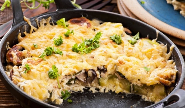 Сиренето, нарязано на парчета, се слага в огнеупорен (глинен) съд. Върху него се поставят нарязаните домати, гъбите и маслото. Захлупва се с капак и се задушава 10 минути. Залива се с разбитите заедн...